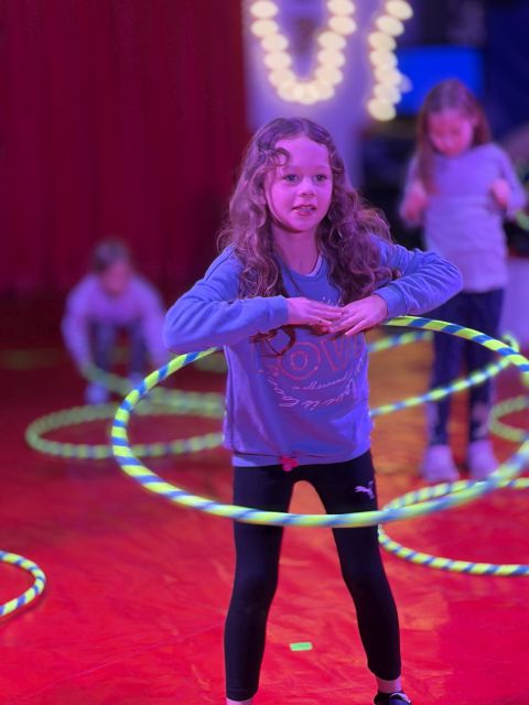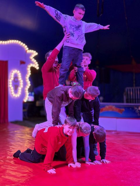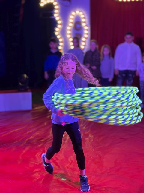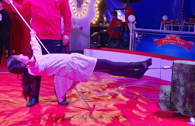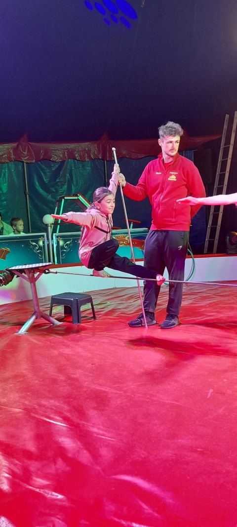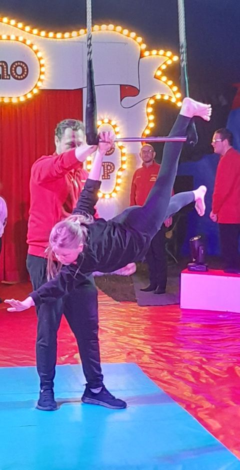 fleißig üben. Es gab Hula-hoop, Trapez, Bodenakrobatik, Glasbalance, (menschliche) Raubtiere, Clowns und Drahtseil im Angebot.